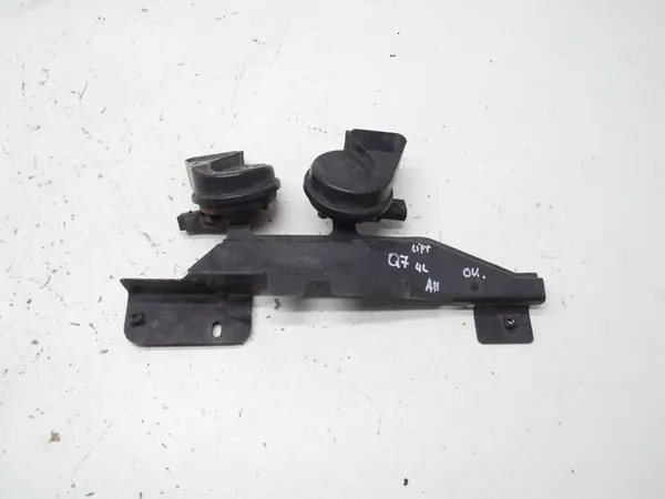 Buzina original alta e baixa para Audi Q7 (2006-2014). As buzinas estão funcionais e em estado usado. Os números das peças incluem 4L0951229A, 4L0951223 e 4L0951221A. Esta é uma versão europeia com um estado de embalagem de substituição.