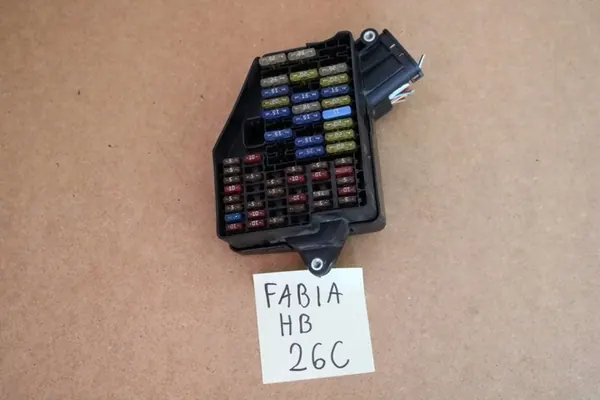 Caixa de fusíveis usada para Skoda Fabia I. O artigo apresenta sinais normais de uso, mas é totalmente funcional. A condição da peça é visível nas fotos fornecidas, que são originais. A peça vem de um desmantelamento legal de veículos e é completamente original.