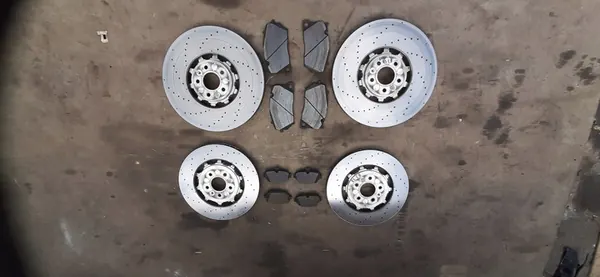 Conjunto completo de discos e pastilhas de freio para Audi RS6 C8, números OEM 4K0615301S e 4K0615601A. Condição usada com uma quilometragem de 15.000 km. O conjunto inclui discos dianteiros esquerdo e direito, discos traseiros esquerdo e direito, e pastilhas dianteiras e traseiras.