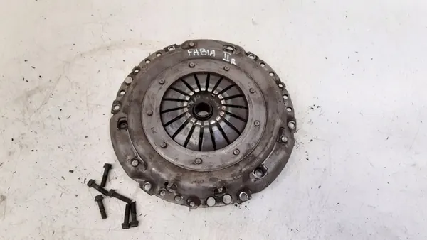 Disco de embreagem e platô de pressão de um Skoda Fabia II LIFT 1.6 TDI KOMBI. A peça é usada e é um componente original com o logotipo do fabricante (OE). É adequada para motores a diesel e é projetada para automóveis de passageiros. Elementos adicionais incluem um volante rígido.