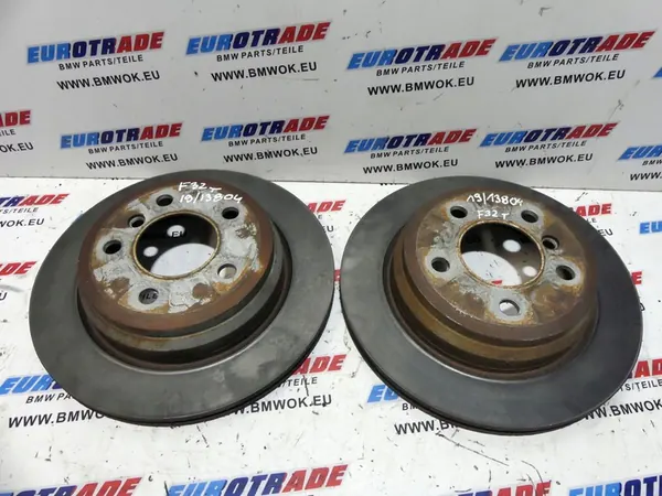 Conjunto de discos de freio traseiros originais usados para BMW Série 3: F30, F31. Número OEM: 6864900. O conjunto vem de um desmantelamento de veículo. Tamanho: 330 x 20mm. Espessura medida: 19.53mm.