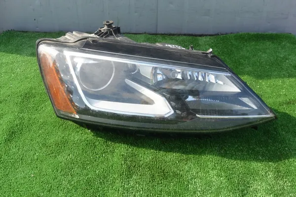 Farol dianteiro esquerdo Xenon LED original para VW Jetta USA, anos de modelo 2015-2018. A peça é tecnicamente funcional, com danos visíveis conforme mostrado nas fotos. Os números de peça OEM incluem 5C7941752G, 8K0941597E e 5N0941329. Outras peças para este modelo também estão disponíveis.