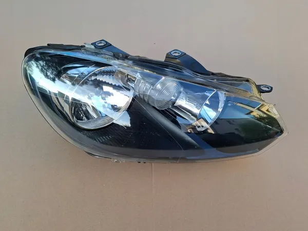 Farol direito para VW Golf VI, sexta geração. A peça está em bom estado e vem de desmontagem. Possui luzes de cruzamento tradicionais/halógenas e é adequada para versões europeias. Esta peça é destinada a automóveis de passageiros e pesa 1 kg com embalagem.