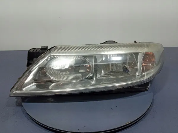 Farol esquerdo para Renault Laguna II, anos de modelo 2001-2005, especificamente para o Grandtour 1.9 DCi MT (107 CV). Esta peça original está em condição usada com danos visíveis, incluindo um ponto de montagem quebrado e uma lente embaçada. O número da peça é 7701048927. O item é consistente com a descrição fornecida.
