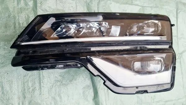 Farol LED dianteiro esquerdo para veículos SKODA KAROQ fabricados após 2012. Os números de peça OEM incluem: 57B941015B, 00205175-05, 7P5941591AD e 7P5941591A. O suporte inferior estava danificado, mas foi reparado com massa de fibra de vidro. A peça está em condição usada.