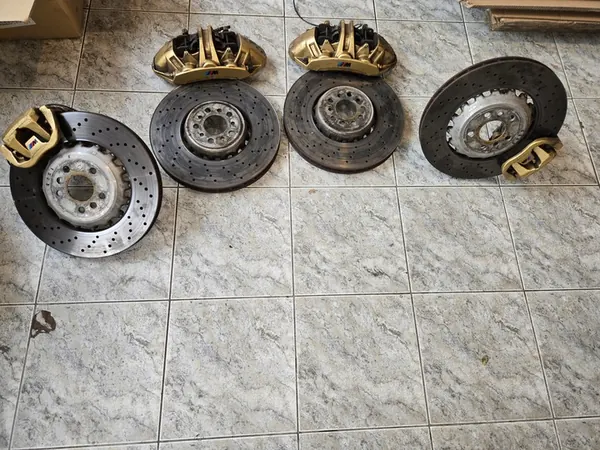 Kit de freios BREMBO completo para BMW M8 (F91, F92, F93) e M5 (F90). Inclui discos dianteiros de 395x36 mm e discos traseiros de 380x28 mm. Peças originais da BMW. As pinças são compatíveis com o kit de freio cerâmico RED.