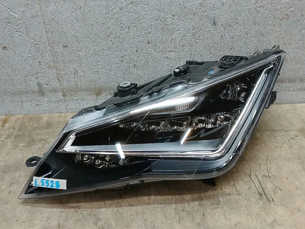 Lanterna frontal esquerda para SEAT LEON III (2013-2017) com luzes LED completas. A lanterna foi reparada, com reparos visíveis na montagem superior e lateral e no vidro, conforme mostrado em fotos adicionais.