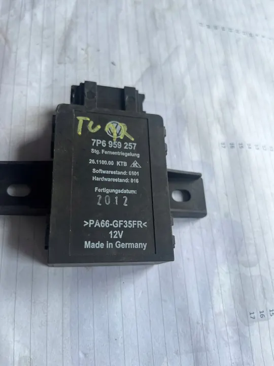 Módulo de controle de assento 7P6959257 para VW Touareg com 68.000 km de uso. Esta é uma peça original da Volkswagen OE, classificada como usada. A peça está na embalagem original e está em conformidade com os padrões de qualidade GVO, apresentando o logotipo do fabricante do veículo (OE).