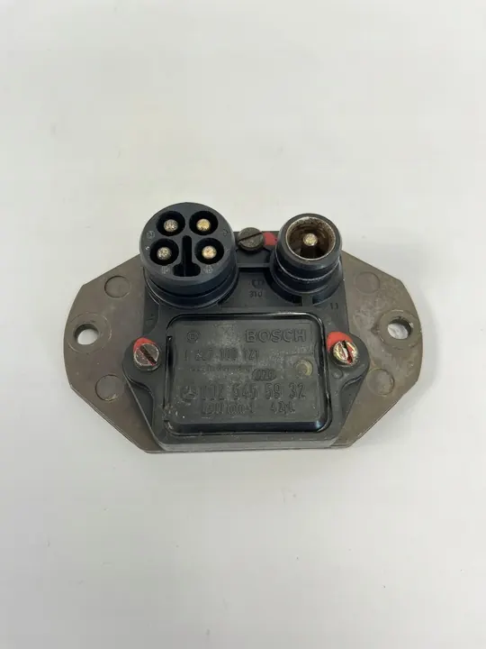 Módulo de ignição usado em condições de funcionamento para veículos Mercedes, especificamente modelos W124 e W201. A peça é um componente de fabricante de equipamento original (OEM) da Mercedes-Benz, identificado pelo número de catálogo 0025455932/SDV02072. Esta peça é adequada para automóveis de passageiros e é de alta qualidade, atendendo aos padrões GVO. Fatura disponível mediante solicitação.