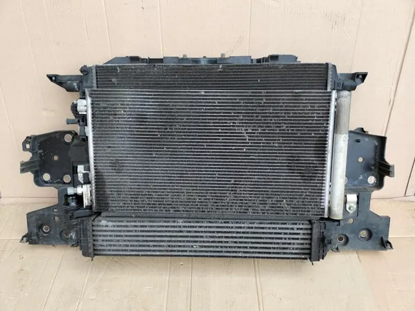 Conjunto de radiador frontal para Renault Scenic III lift Xmod 1.6 DCI, modelo 2013. As peças são provenientes de veículos usados e podem apresentar sinais de desgaste e desmontagem. O produto está em condição usada e vem com fatura de IVA. A qualidade é original com o logotipo do fabricante (OE). A peça é adequada para automóveis de passageiros e pesa 10 kg com embalagem. Os números de peça OEM incluem 214101448R, 921000294R e 144969568R. Disponível na versão europeia.