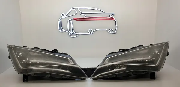 Conjunto de lâmpadas LED usadas para SEAT LEON III, lados esquerdo e direito, OEM 5F1941007F. Versão europeia com sinais normais de uso. O vidro está danificado e é adequado para regeneração. A carcaça está intacta e vem de um único veículo. O ajuste de altura é elétrico. Fotos autênticas são fornecidas.
