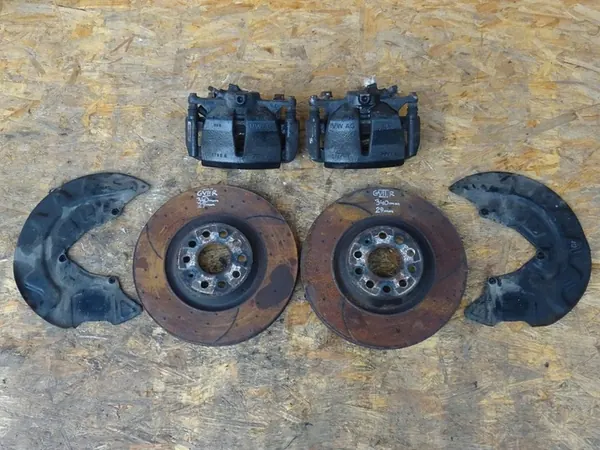 À venda: Troca de freios dianteiros (discos, capas, pinças) para Volkswagen GOLF VII R 2.0 TSI 4MOTION, anos de produção 2013 - 2019. Números OEM: 5Q0615311F, 5Q0615312F. Diâmetro dos discos: 340 mm, espessura: 29 mm. Discos perfurados e sulcados. Código do motor: CJX. Usado, em muito bom estado, totalmente funcional. As fotos refletem a condição real do item.